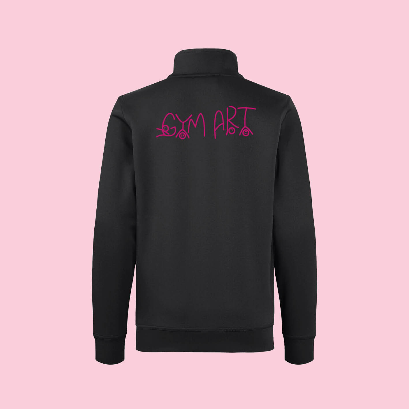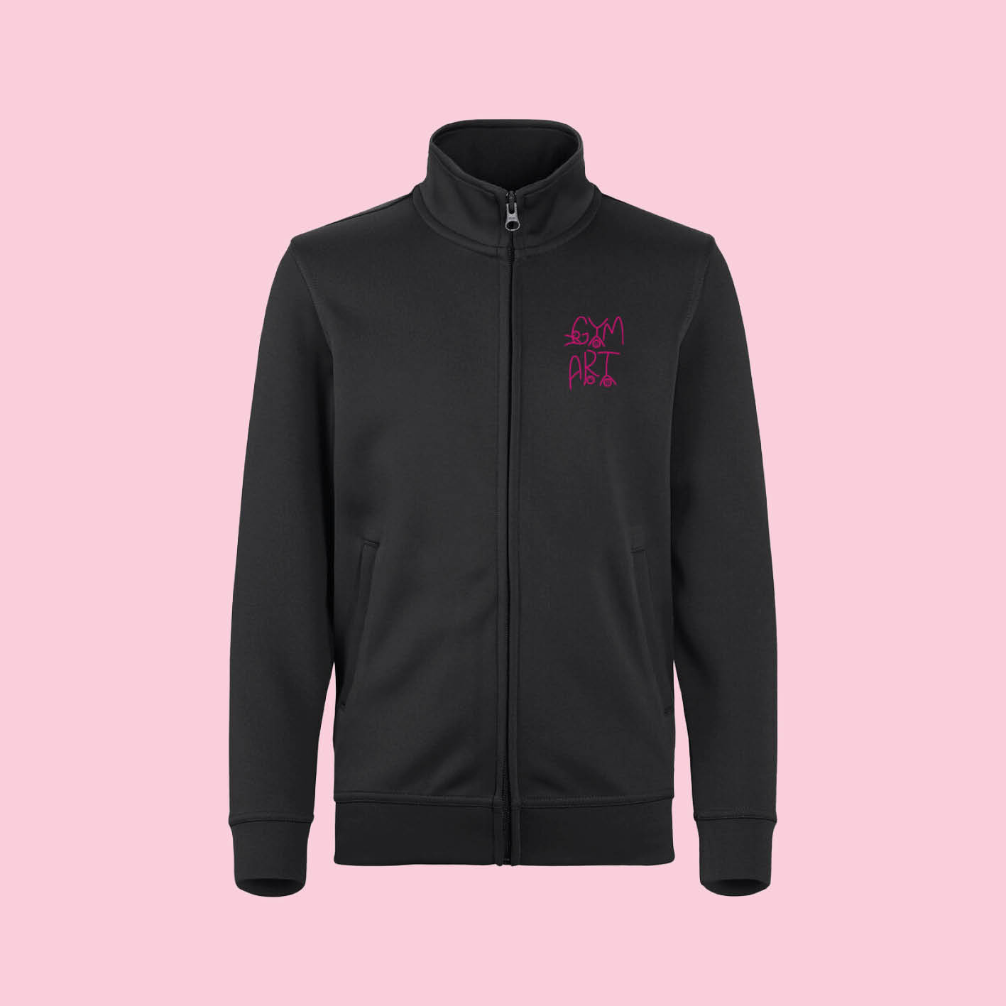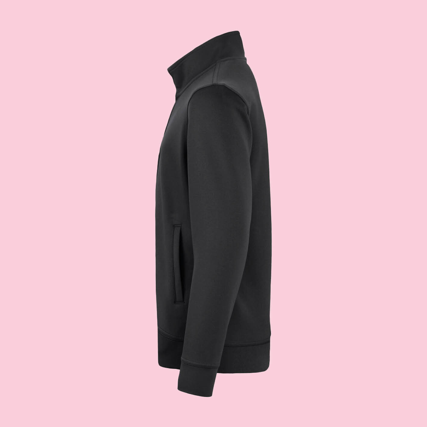 Felpa cardigan in tessuto tecnico a collo altro con zip intera e tasche laterali. Tessuto elasticizzato non garzato. Tasche con zip e asole per auricolari; 100% poliestere_280 g/m².