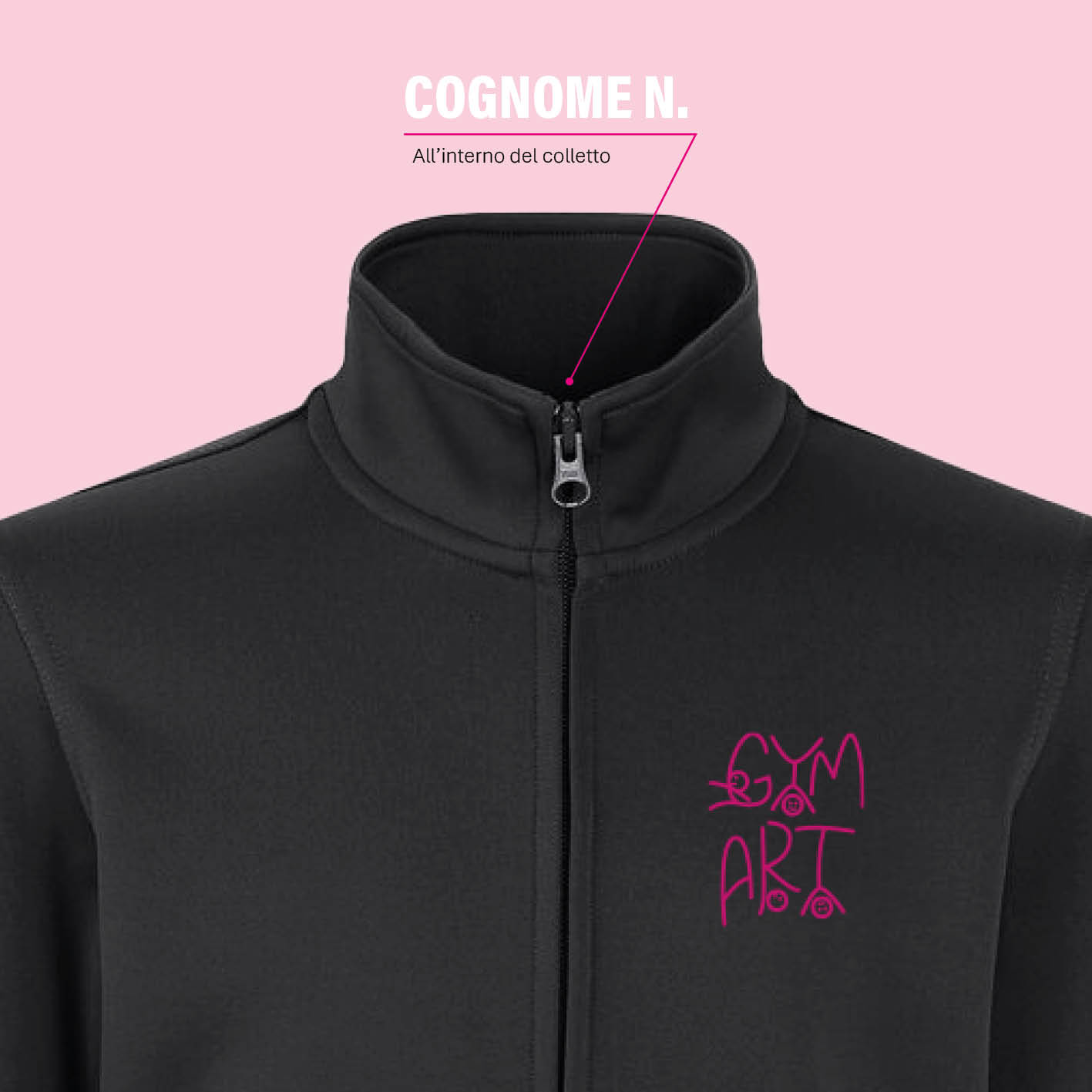 Personalizzata con ricamo a cuore e sulle spalle della società. All'interno sarà applicato il Cognome N. della ginnasta.